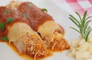 Sauté the garlic and onion, add the chicken and all the seasonings, and let brown. Deglaze with the water from cooking the chicken , season and add the other ingredients except the herbs, always keeping the chicken slightly moist.